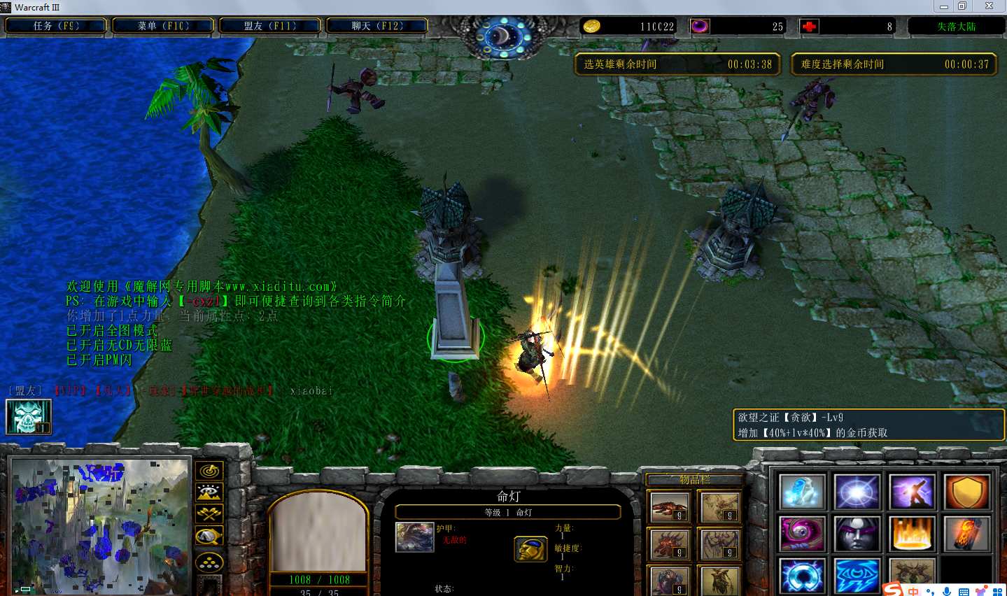 地图名字:失落大陆8.9.8地图下载+全商城特权+全存档+隐藏英雄+无CD+指令功能