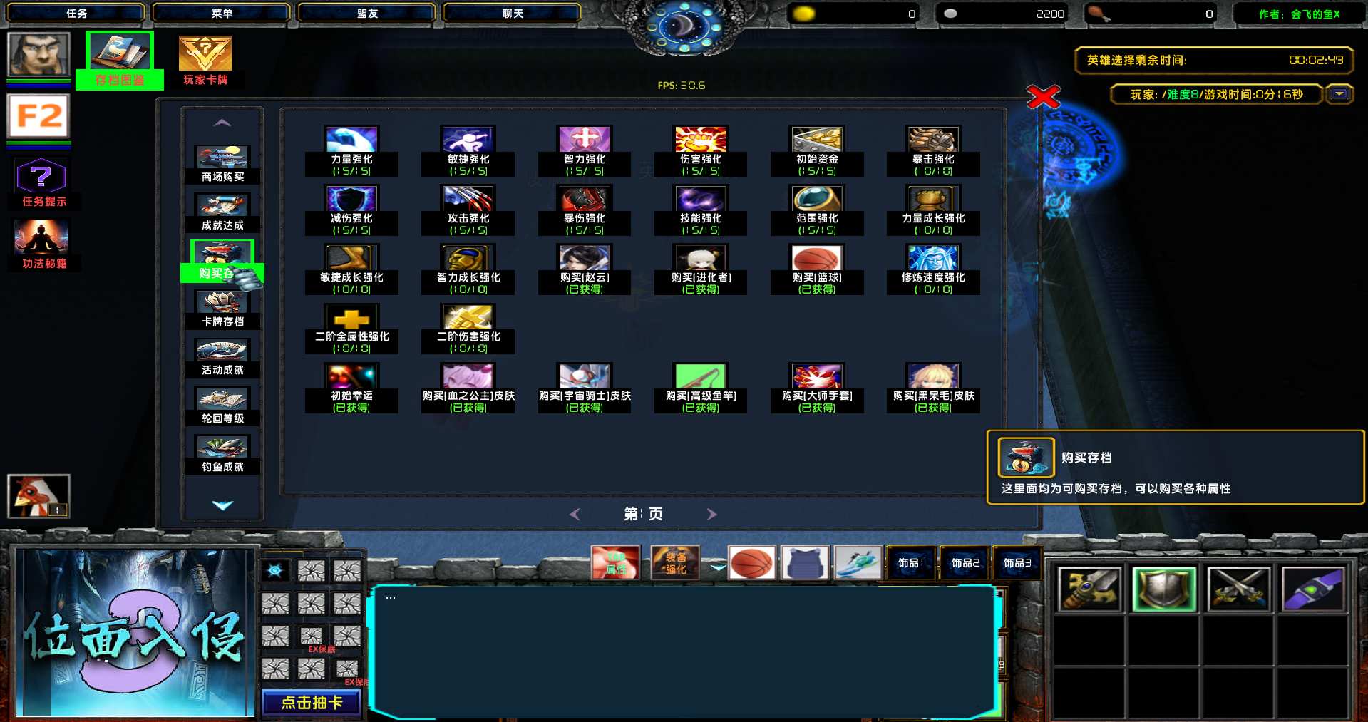 地图名字:位面入侵3 1.2.3地图下载+全商城特权+全存档+隐藏英雄+无CD+指令功能