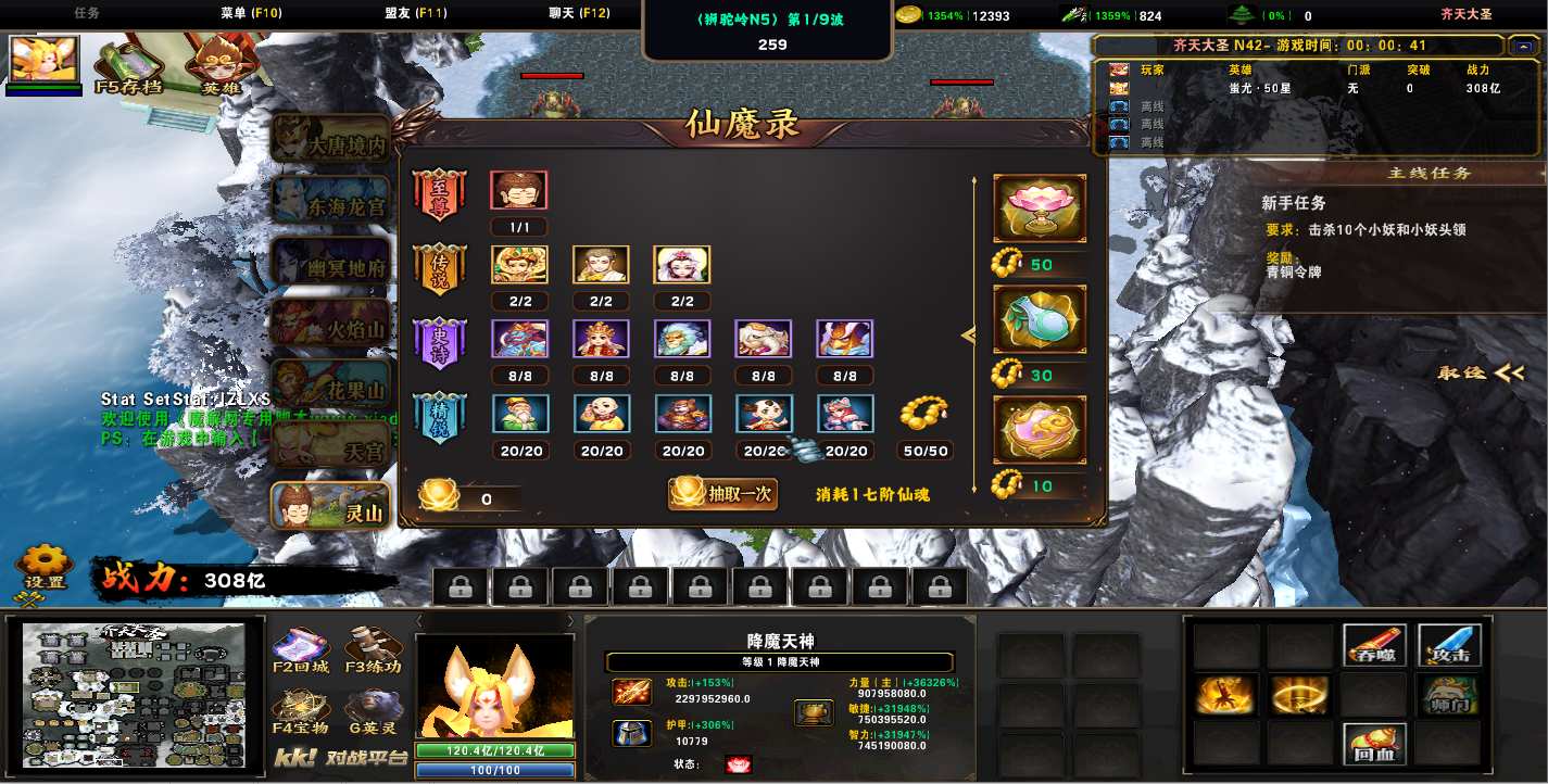 地图名字:齐天大圣1.0.296地图下载+全商城特权+全存档+隐藏英雄+无CD+指令功能