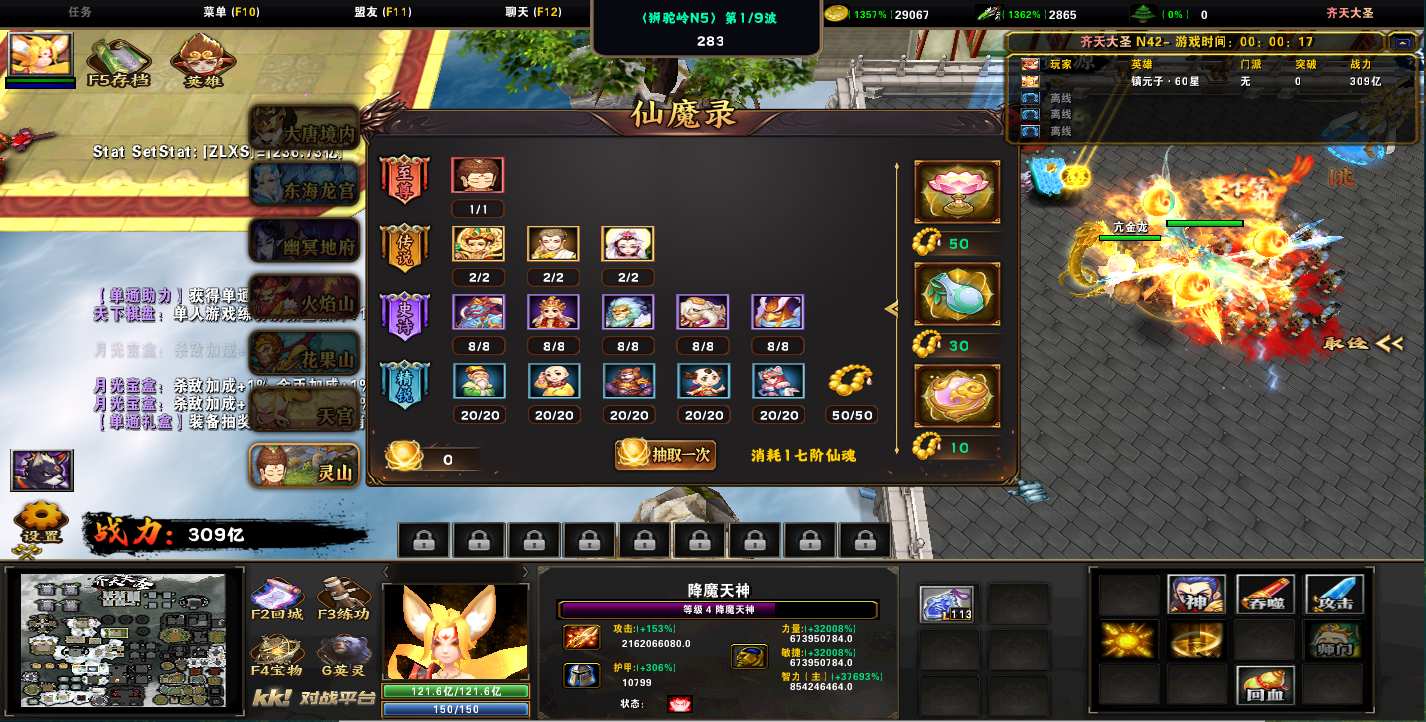 地图名字:齐天大圣1.0.299地图下载+全商城特权+全存档+隐藏英雄+无CD+指令功能