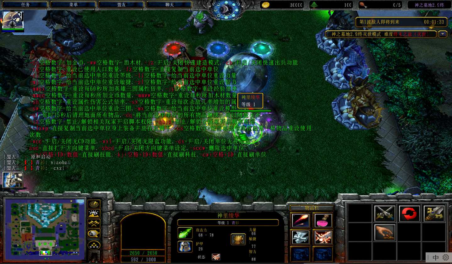 地图名字:神之墓地2.9终1.4.85地图下载+全商城特权+隐藏英雄+无CD+指令功能