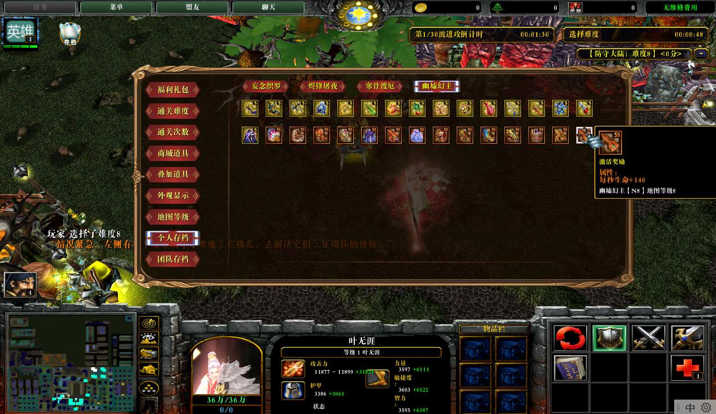 地图名字:防守大陆1.0.10地图下载+全商城特权+全存档+隐藏英雄+无CD+指令功能