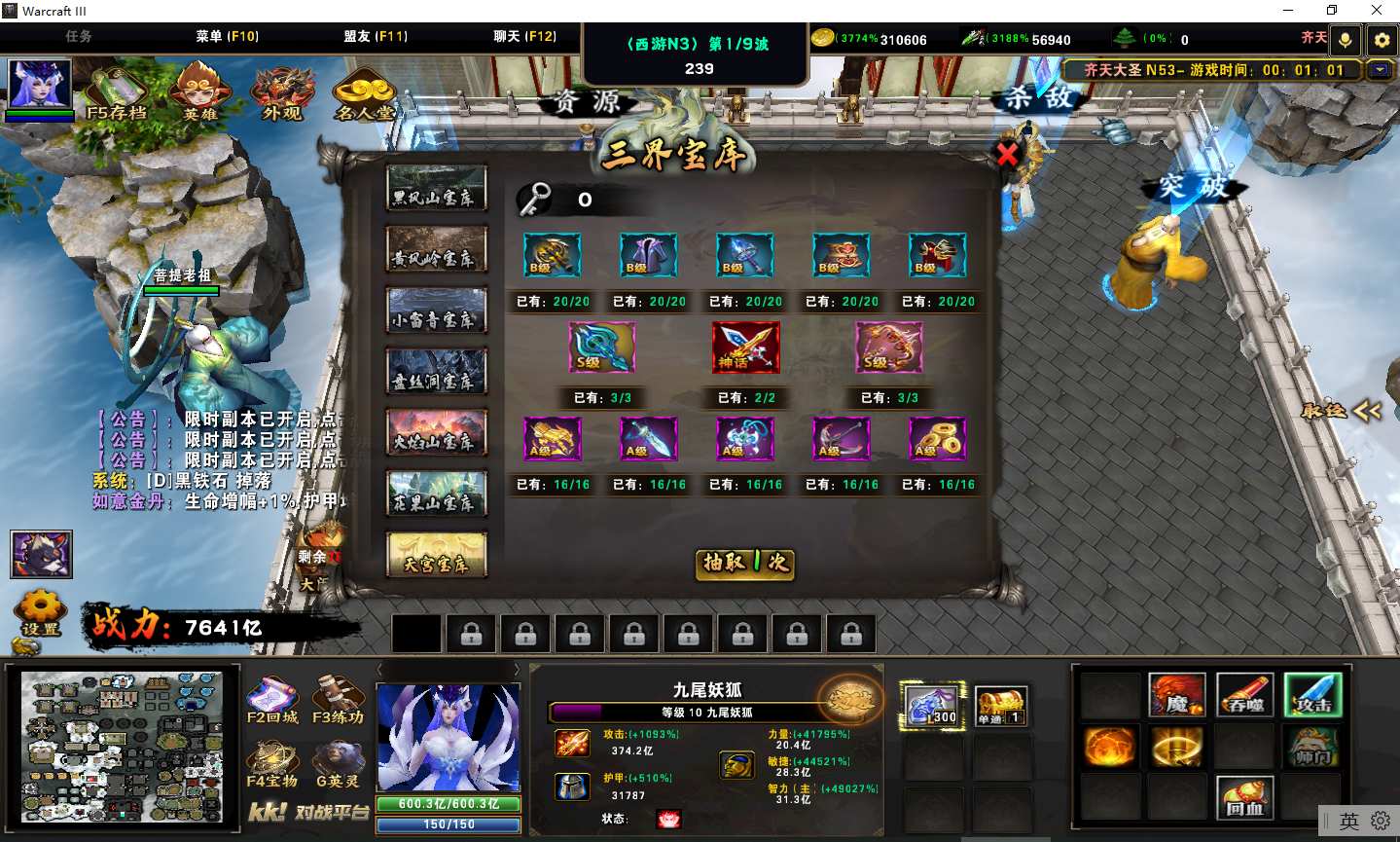地图名字:齐天大圣1.0.374地图下载+全商城特权+存档+隐藏英雄+无CD+指令功能