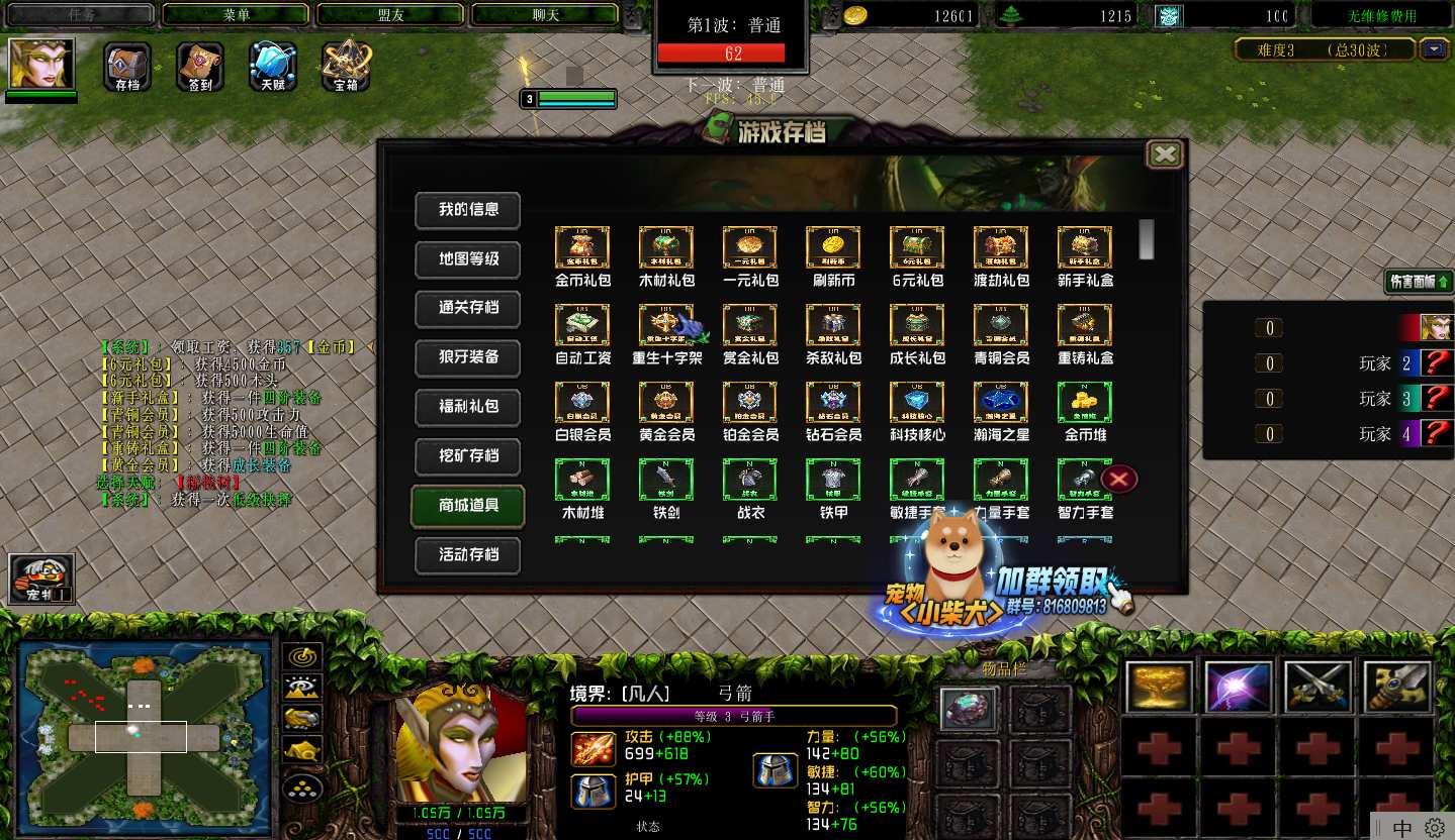 | 技能菜单【光环类技能】 | 自动化菜单【自动加钱木,提升英雄三围】 |
